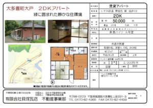 アパート空室情報!! アパート空室情報です!! 大多喜町大戸、2DKの平屋アパートです。 一部クロス張替、クリーニング済(殺菌・消毒)で10月上旬から入居可能です。 お問い合わせお待ちしております。 Kenji Kaizuka 2021-10-03